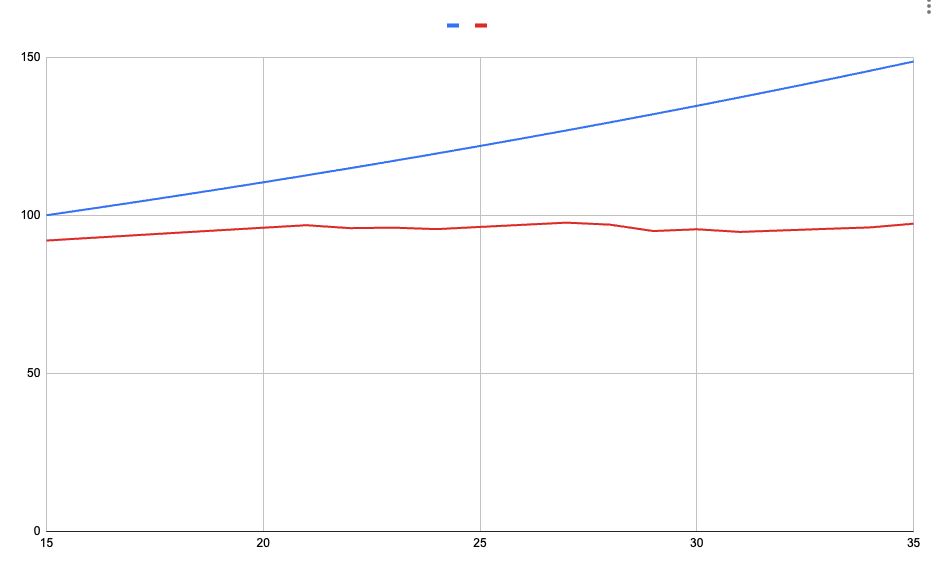 Il grafico dimostra la stabilità delle prestazioni dell'impianto trattato (linea rossa) rispetto al non trattato (linea blu) all'aumentare della temperatura esterna (15°C to 35°C). La nanotecnologia riduce drasticamente lo sforzo del compressore in condizioni critiche.
